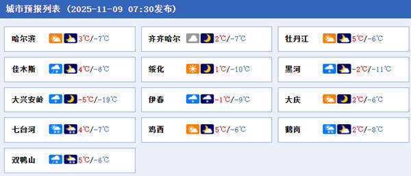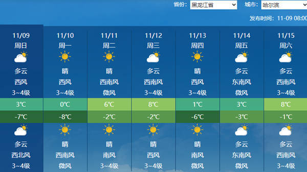 中国天气网讯 今天(11月9日),黑龙江多地仍将出现降雪;明天大部转晴,但白天气温将明显下降,哈尔滨最高气温或跌至冰点。此外,今明两天黑龙江大部最低气温将持续走低,多地寒意较强,需注意保暖防寒。